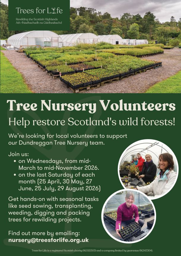 The Dundreggan Rewilding Centre is seeking volunteers for the 'Trees for Life' programme, see the poster for more information.